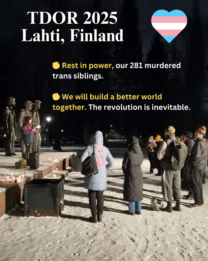 20.11.2025 klo 18 kokoonnuimme Lahessa Fellmaninpuiston Punaisten muistomerkille muistamaan 281 kuluneen vuoden aikana murhattua trans-sisarustamme. 15 toveria osallistui rinnallamme muistamaan menehtyneitä sisaruksiamme.