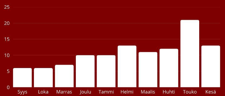 Kuvan taulukko näyttää LANKA -verkoston aktiivijäsenmäärän vähintään kaksinkertaistuneen jopa 6 kuukaudessa jatkaen tasaista kasvua. Verkostomme on taulukon ajanjaksolla järjestänyt noin 100 päivänä monipuolista toimintaa 10 kk:n aikana. Alkupäässä korostui teoria ja yhteisöllinen työ, mutta viime kuukausina yhteisöllisen toiminnan ja teorian opiskelun rinnalle on tullut paljon käytännönläheisempää toimintaa. Aktiivien määrä on noussut tarpeeksi jalkauttaaksemme ihmisiä jopa neljään järjestämäämme mielenosoitukseen noin kuukauden ajanjaksolla (elo-syyskuussa 2025).